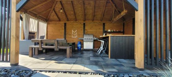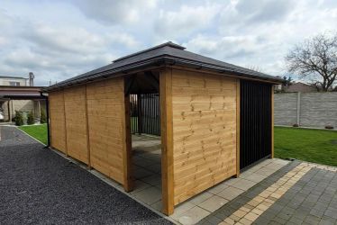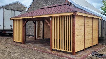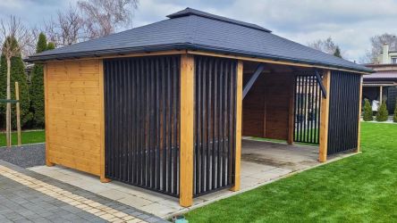 - Dach oraz zabudowa ścian wykonane z podbitki sosnowej łączonej metodą kanadyjską na pióro-wpust grubości 20 mm