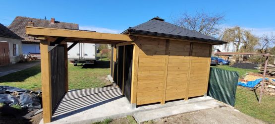 - Dach oraz zabudowa ścian wykonane z podbitki sosnowej łączonej metodą kanadyjską na pióro-wpust grubości 20 mm