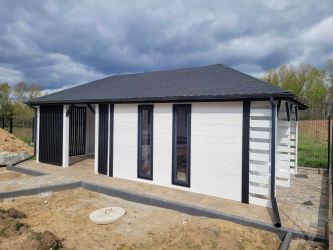 - Ściany domu wykonane z podbitki sosnowej łączonej metodą na pióro-wpust
