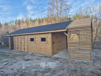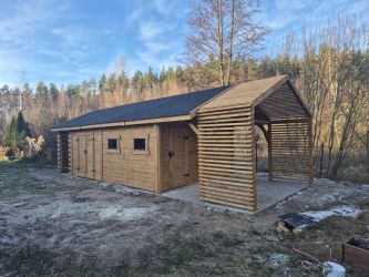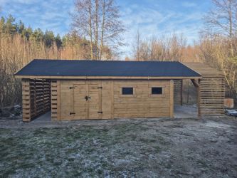 - Domek 5,5x4m, Drewutnia 1,5x4m, Taras 1,5x4m, Pergola 1,5x4m