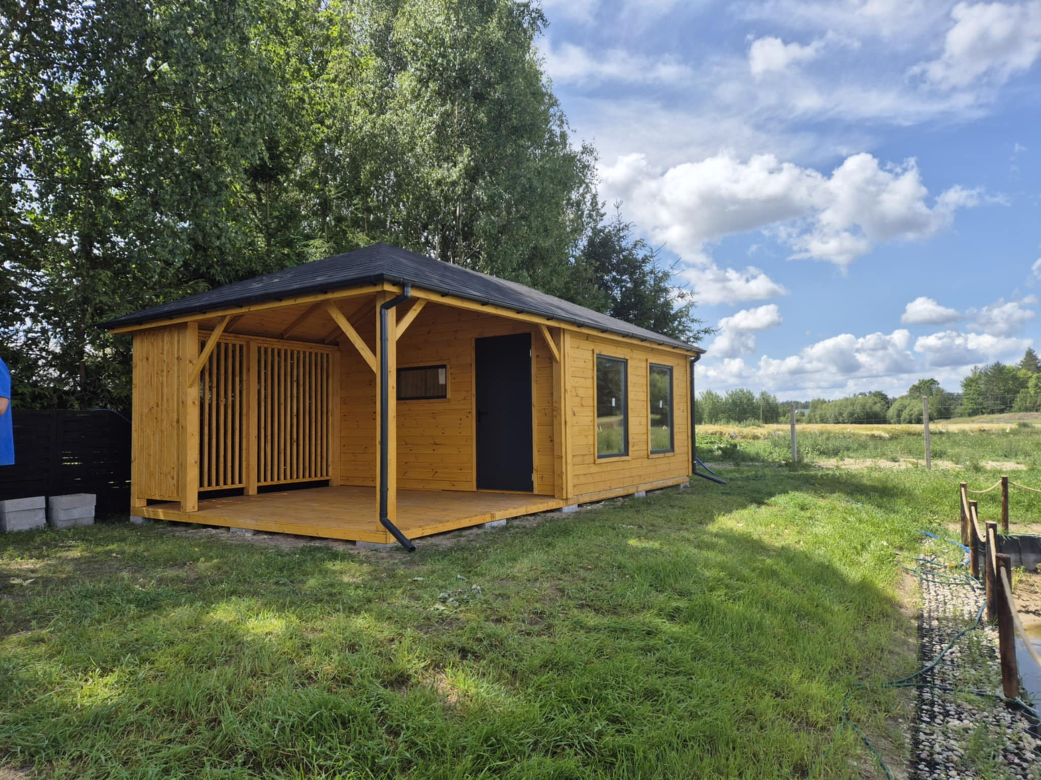 - Ściany domu wykonane z podbitki sosnowej łączonej metodą na pióro-wpust