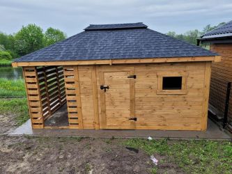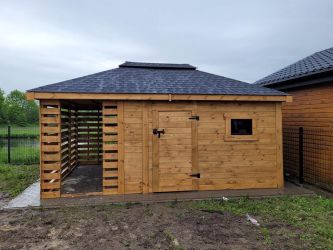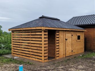 - Domek o wymiarach 300 cm x 350 cm plus drewutnia 300 x 150 cm