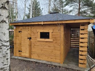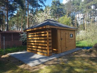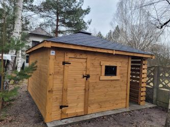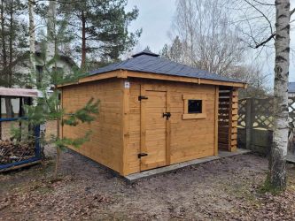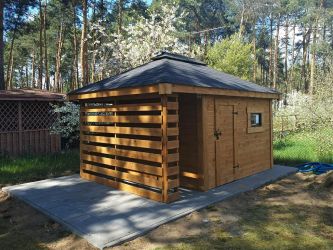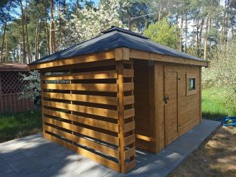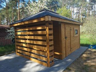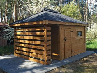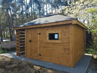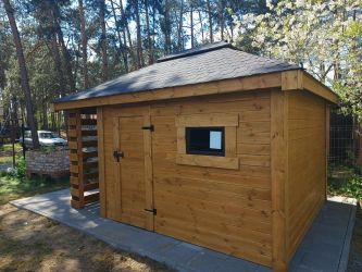 - Domek o wymiarach 300 cm x 300 cm plus drewutnia 300 x 100 cm