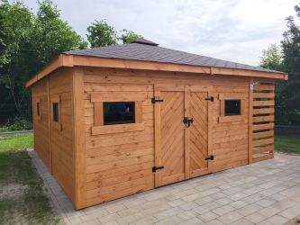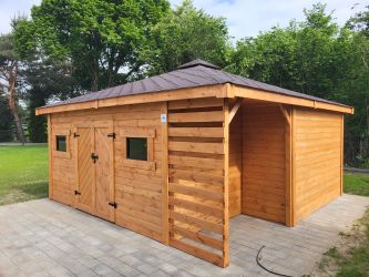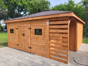 - Wymiary podstawy domku 500 x 500 cm w tym drewutnia 200 x 100 cm