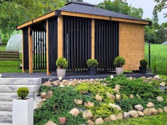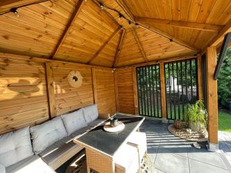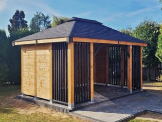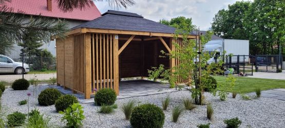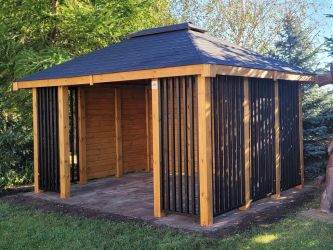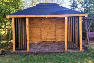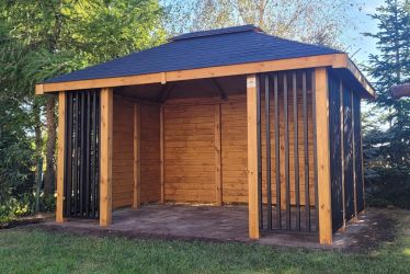- Dach oraz zabudowa ścian wykonane z podbitki sosnowej łączonej metodą kanadyjską na pióro-wpust grubości 20 mm