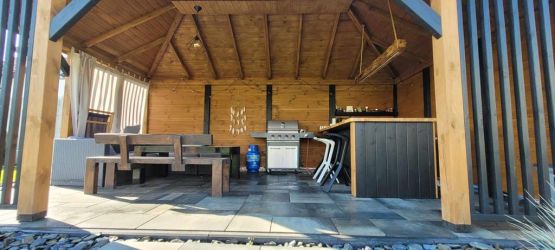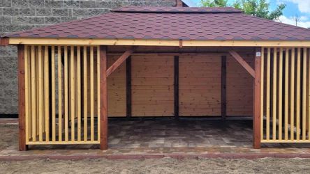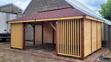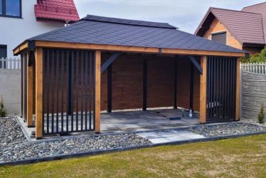 - Dach oraz zabudowa ścian wykonane z podbitki sosnowej łączonej metodą kanadyjską na pióro-wpust grubości 20 mm