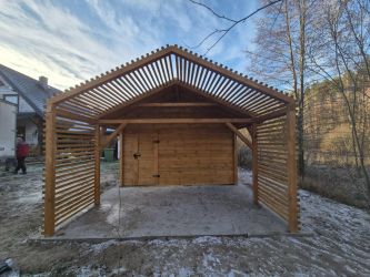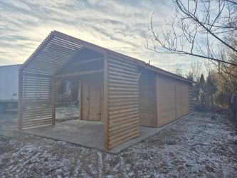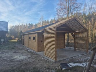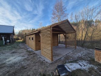 - Domek 5,5x4m, Drewutnia 1,5x4m, Taras 1,5x4m, Pergola 1,5x4m