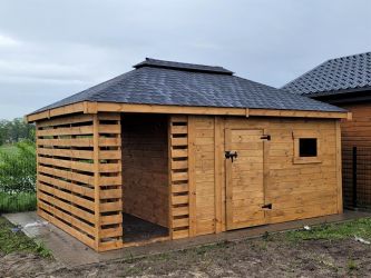 - Domek o wymiarach 300 cm x 350 cm plus drewutnia 300 x 150 cm