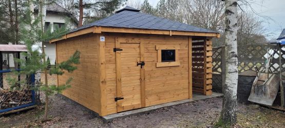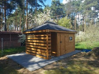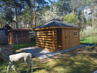 - Domek o wymiarach 300 cm x 300 cm plus drewutnia 300 x 100 cm