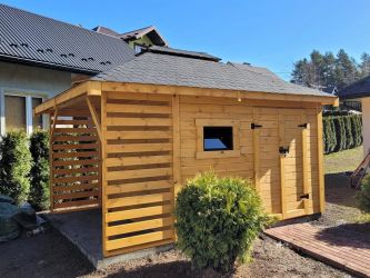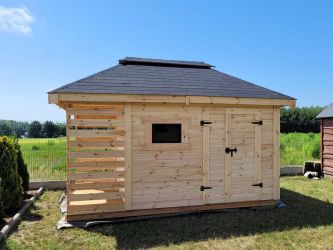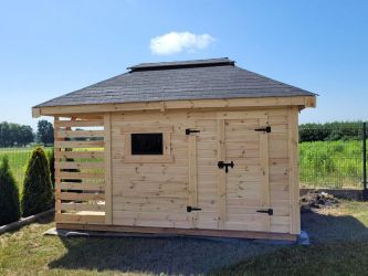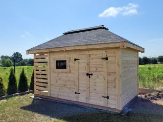 - Domek o wymiarach 300 cm x 300 cm plus drewutnia 300 x 100