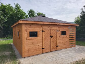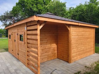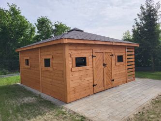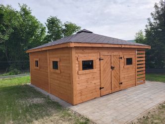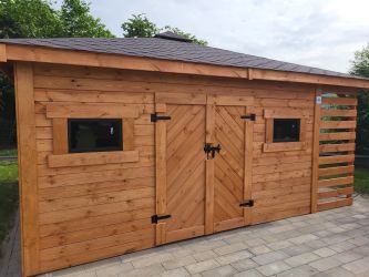 - Wymiary podstawy domku 500 x 500 cm w tym drewutnia 200 x 100 cm